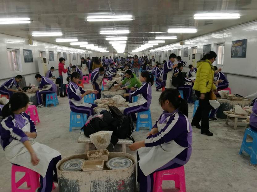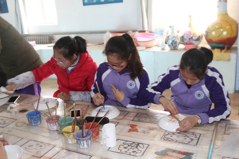 在理论课的基础上,学生亲身制作体验陶艺。在彩绘厅,学生们在瓷器上亲笔绘制自己心目中的形象和意境,充分表达自己的思想感情,感受艺术性和思想性的统一。在泥塑厅,学生兴致高涨,通过自己的双手用专业塑泥构思创作立体造型。在拉坯厅,听完专业指导老师操作方法的介绍和演练后,学生兴致勃勃,做的有模有样,在拉坯机的转盘旋转中感受陶瓷艺术的魅力,在一次次成功和失败中磨练恒心和毅力。