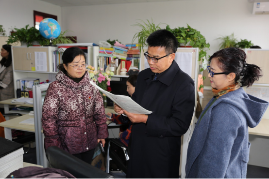 任志瑜校长走进办公室,与老师们亲切交谈。通州校区校务委员陪同参加活动。